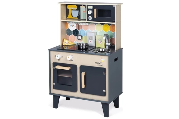 Diese Candy Chic Kinderküche von Janod ist mit allen möglichen Geräten ausgestattet! Das Induktionskochfeld gibt Sound und LED-Licht. Die Knöpfe sorgen auch für Soundeffekte. Sie finden auch ein Waschbecken mit Wasserhahn, Kühlschrank, Mikrowelle und Backofen. Zubehör ist ebenfalls enthalten: Lebensmittelboxen, eine Uhr, eine Pfanne und einen Servierlöffel. Die Höhe der Arbeidsplatte beträgt 50 Zentimeter.