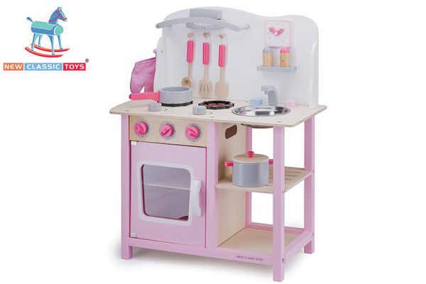 Holz Kinderküche der Marke New Classic Toys. Die Holz Spielküche ist ausgestattet mit Topf, Pfanne, Topflappen, Salz- und Pfefferstreuer, Pfannenwendern, Uhr und herausnehmbarer Spüle. Die Bon Appetit Kinderküche ist ein Traum für Jungen und Mädchen die gerne kochen und backen.