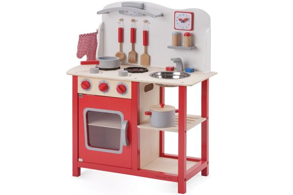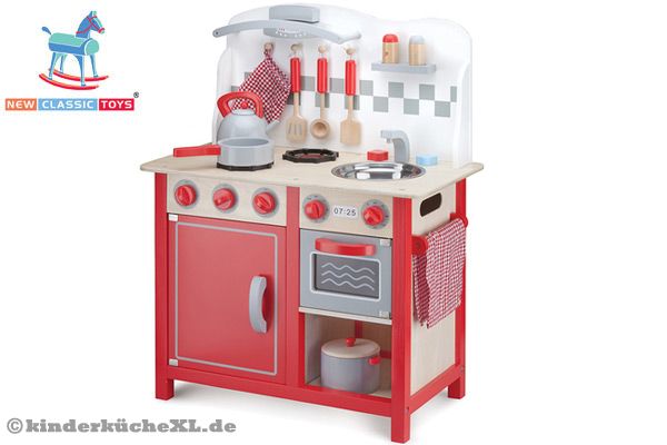 Kinderküche Modern von New Classic Toys. Diese Spielküche ist aus Holz und hat moderne, rote Farbakzente. Diese moderne Kinderküche ist ausgestattet mit Ofen, Mikrowelle und Kühlschrank. Lieferung inklusive 2 Töpfen und Pfannenwendern, so können kleine Köche sofort die leckersten Gerichte zaubern.
